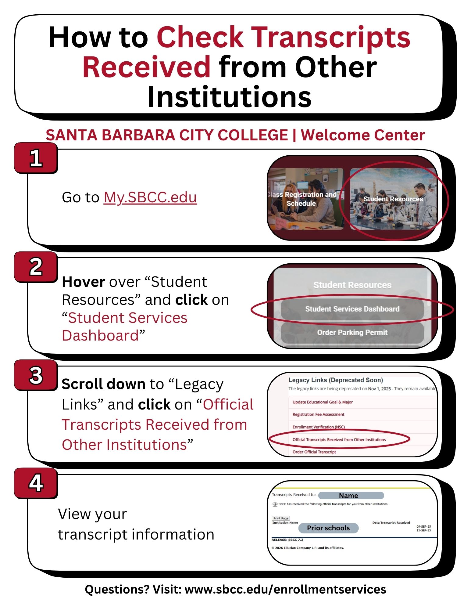 I ordered transcripts from my previous college, how can I find out if they have been received by SBCC? Use the campus portal to see if SBCC has received official transcripts that you have had sent from other institutions. Follow these step-by-step instructions .